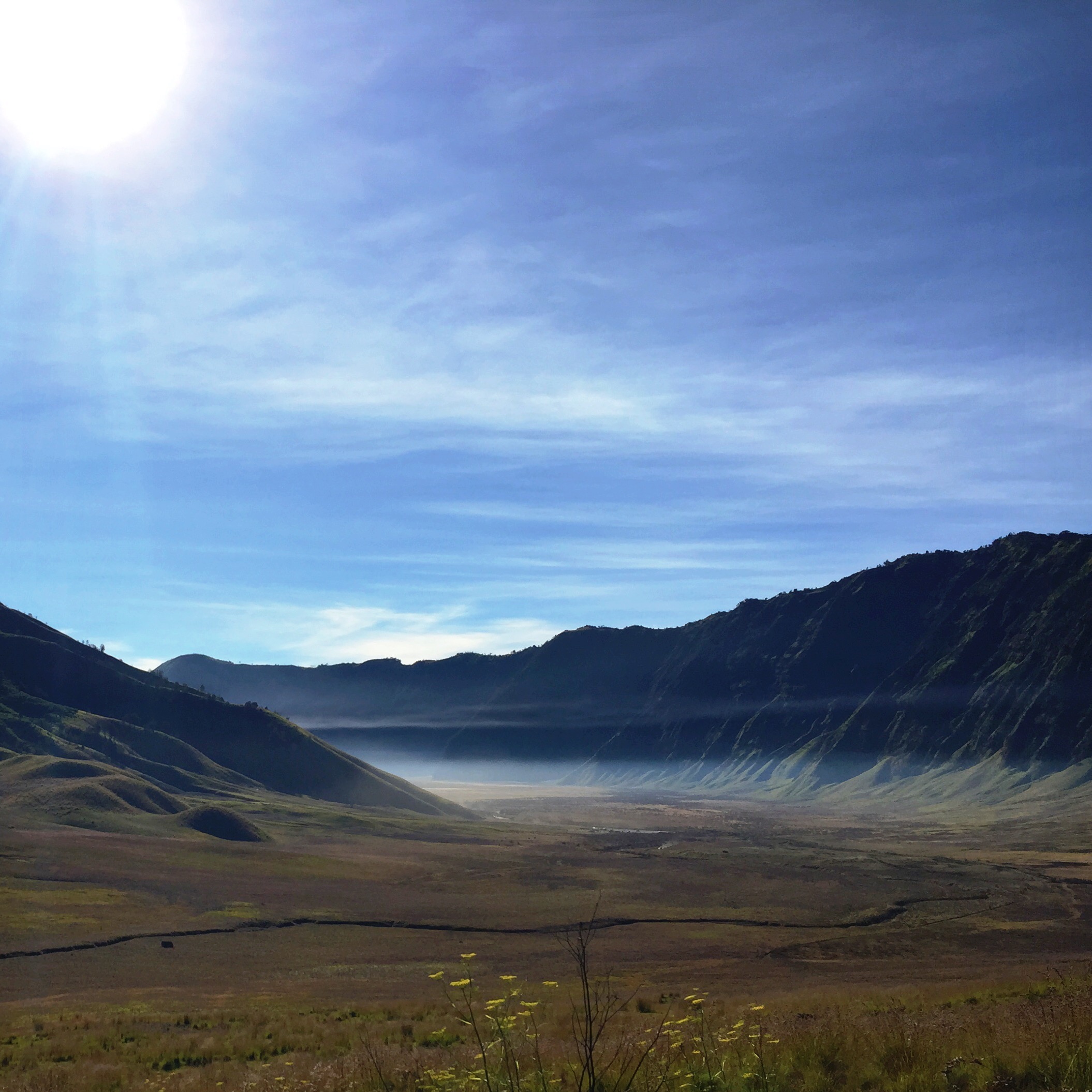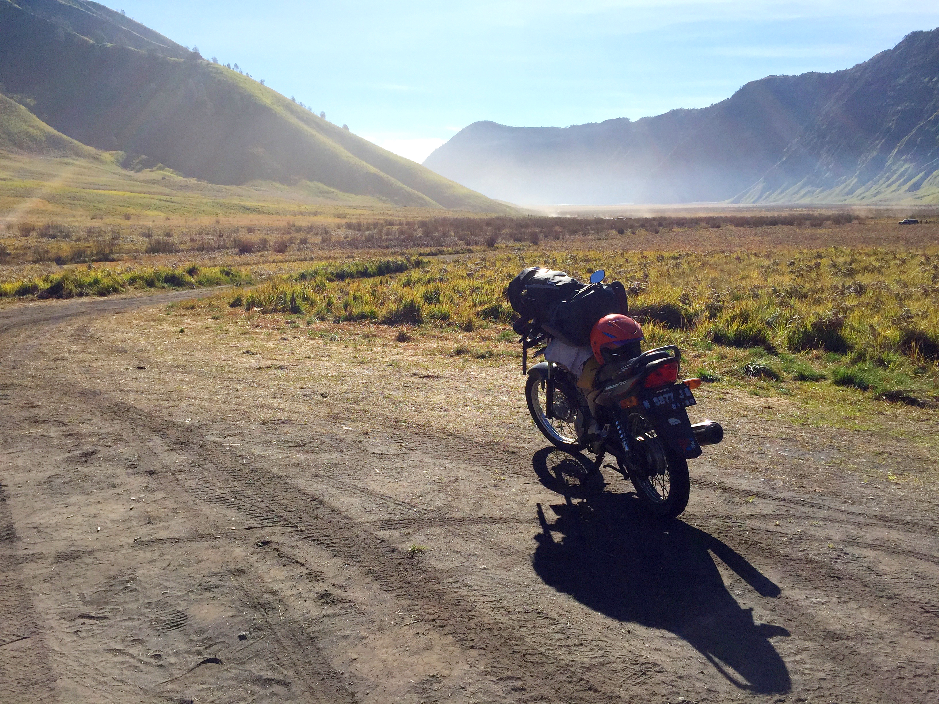 The journey to Cemoro Lawang was quite enjoyable at first. I passed by the beautiful Ngadas village which was really good for pictures! That was before reaching the Teletubbies Hills and the Savanna. The road was smooth and I really enjoyed looking at the distant terraces and cliffs and mountains and large trees. But it got really bad as we went downhill on the extremely bumpy road, while going down to the valleys. My body kept sliding down on the bike and I couldn’t control my posture because of the shaky ride. I would just let go and let my whole body weight pressed on the driver’s back. But I also wanted both of us to be safe, so I tried hard to push myself back with my leg muscle. My thigh muscles got so tired and shivered after a while. Like a muscle failure for trying to support my heavy body. That was when I realised I could just hold on to the handles at back of the motorbike. It worked so well. Thank goodness.