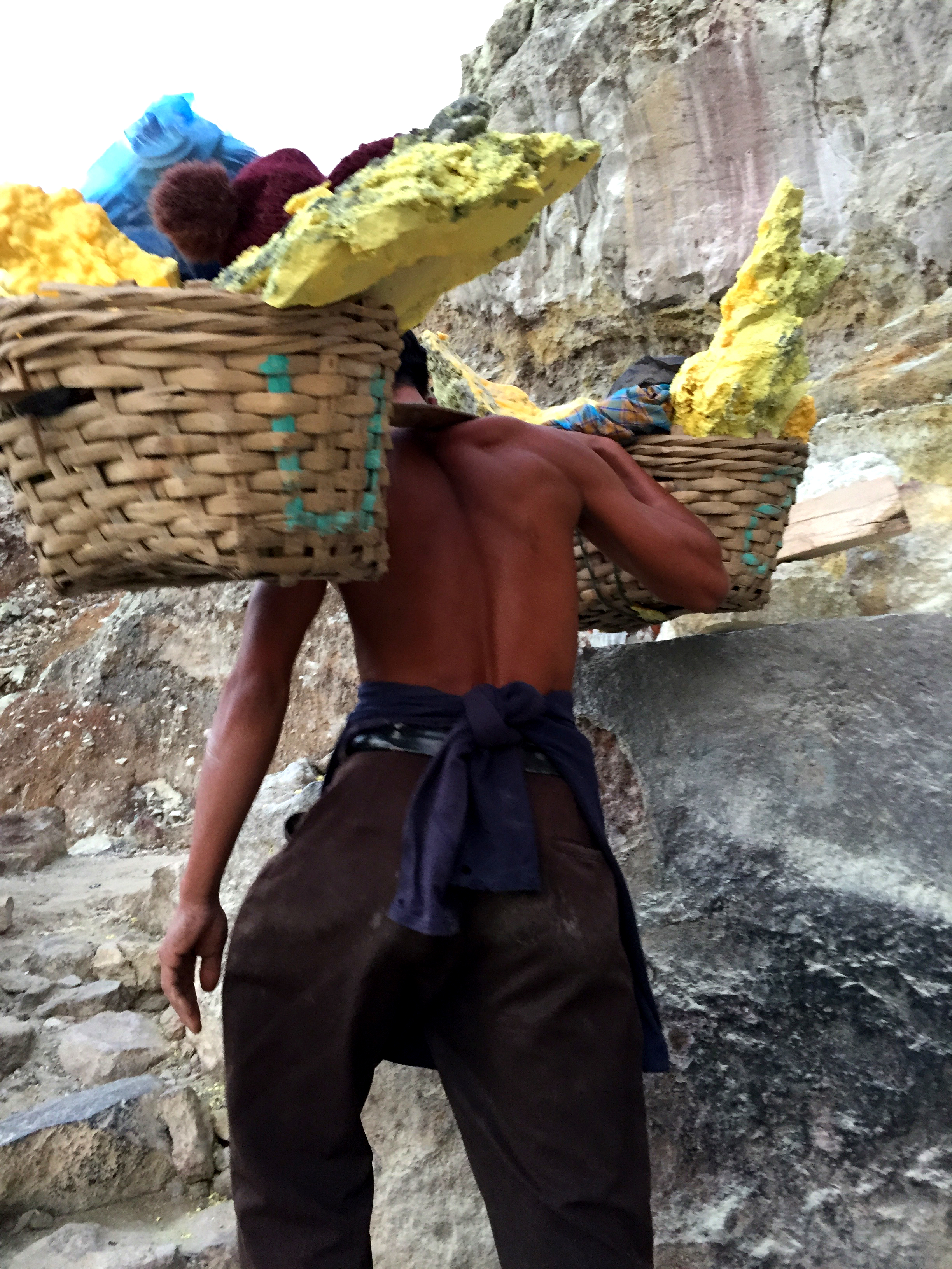 There were rocks everywhere on the way down to the crater. The miners were carrying their 70kg-or-so sulfur up to the caldera and they were the reason why I pressed on. Such hard workers! I asked our guide how much they’d get from those load and he said Rp 1,200 per kg. Usually the miners would do the hike we did twice a day, with 70-80 kg load when they return. I couldn’t even lift the load. Hiking with it is unimaginable.